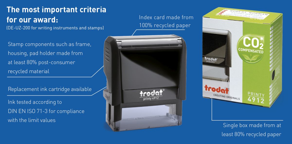 As the first stamp manufacturer we were awarded the "Blue Angel" ecolabel, which is well known and important in Europe, in mid-October for the original Trodat Printy 4.0 models 4910, 4911, 4912, 4913, 4914 and 4915 (eco-black and eco-grey with black ink cartridge)!
